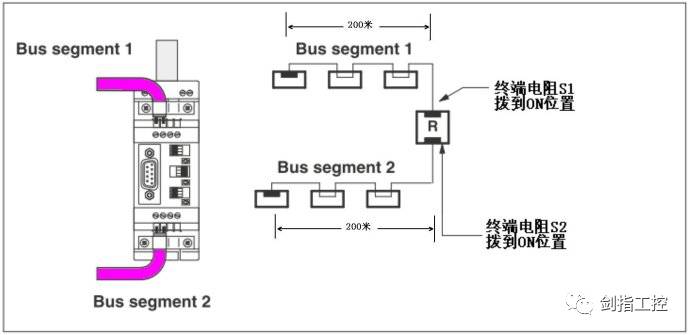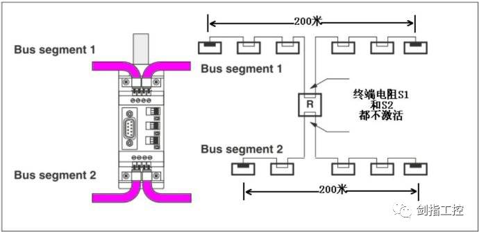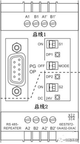 “一根总线不接撇,电阻打到ON那里” 从其内部电路图(图2)也可看出,端子号带撇的端子只是短接,因为左右之间短接同一个信号,所以没有信号放大作用。第二句话是说的中继器上终端电阻的设置问题。从图1中可以看到,中继器上有两个终端电阻S1和S2,分别对应总线段1和总线段2。从图2中可以看出,终端电阻如果拨到ON的位置的话,会在总线AB之间接入一个电阻,同时会将端子号带撇的端子与同组的端子断开。因此,如果中继器是本网段总线上最后一个站点的话,应将DP总线接入端子号不带撇的端子上,同时将终端电阻拨到ON的位置。如果总线只接A1B1,终端电阻S1就要拨到ON位置。如果只接到A2B2,那么终端电阻S2就拨到ON。如果一个总线段的4个端子都接线了,那么对应的终端电阻就不激活。