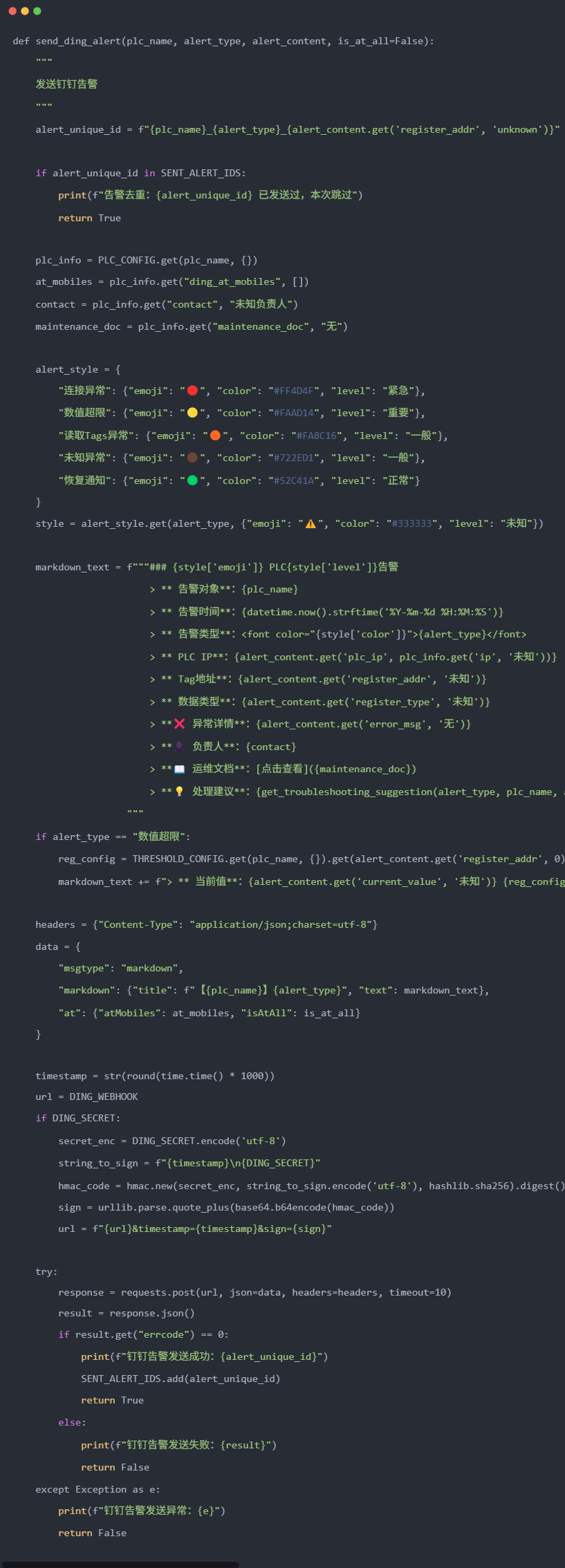 send_ding_alert(plc_name, "Modbus异常", {"register_addr": register_addr, "error_msg": error_msg})如果已经封装好了,可以使用模块名. send_ding_alert();