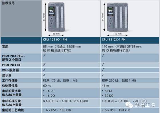 CPU1511C-1 PN 的宽度仅为 85 mm,集成有16路数字量输入和16路数字量输出,及5路模拟量输入和2路模拟量输出,集成1对PN口,CPU位处理能力为 60ns。