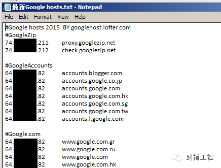 一、首先,从剑指工控下载最新的hosts文件。这里提供一个最新的Google的hosts文件(具体下载链接,关注剑指工控后发送 google 后获得连接)