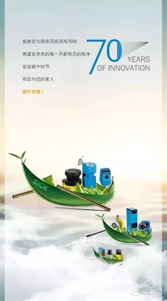 接下来出场本来也没想好,本想找一个日企比如三菱和欧姆龙,但是笔者还是有狭隘的民族情结,就选了一个自动化小品牌SICK,刚才上面四个是自动化的巨头,接下来让我们看看作为自动化的绿叶企业,这些自动化企业属于二三线,产品多数聚焦某个领域,或者产品主要覆盖传感器和IO末端。我们通过这幅图片可以看到SICK的公司在端午的祝福,设计的非常好,也很可爱。小公司都有个特点,就怕别人说他小,那怎么办呢,SICK先把公司70年放在很大地方,告诉客户和竞争对手我们都是70岁了,不小了不能小瞧我们,我们是深度和沉淀的。然后通过图中粽子叶承载粽子和SICK的产品有反馈出来小公司本来的弱点,那就是生怕别人不知道他们的产品,刚才上面四大自动化巨头你没发现只有品牌没有任何产品吗?这就是巨头人家只做品牌,不用担心产品不会客户知道。但是要说一句SICK产品还是不错的,这里没有任何广告嫌疑,SICK也没有给我好处费。但要说一句,SICK的市场部不太给力,这样的一个宣传很讨巧但是有很大差距。
