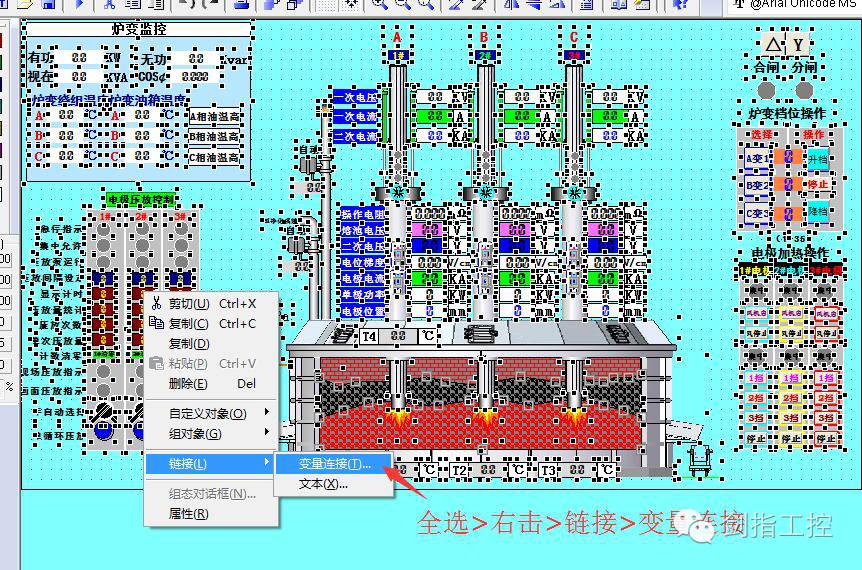 1.点画面空白处Ctrl+A全选画面里的元件→右击→选链接→变量连接