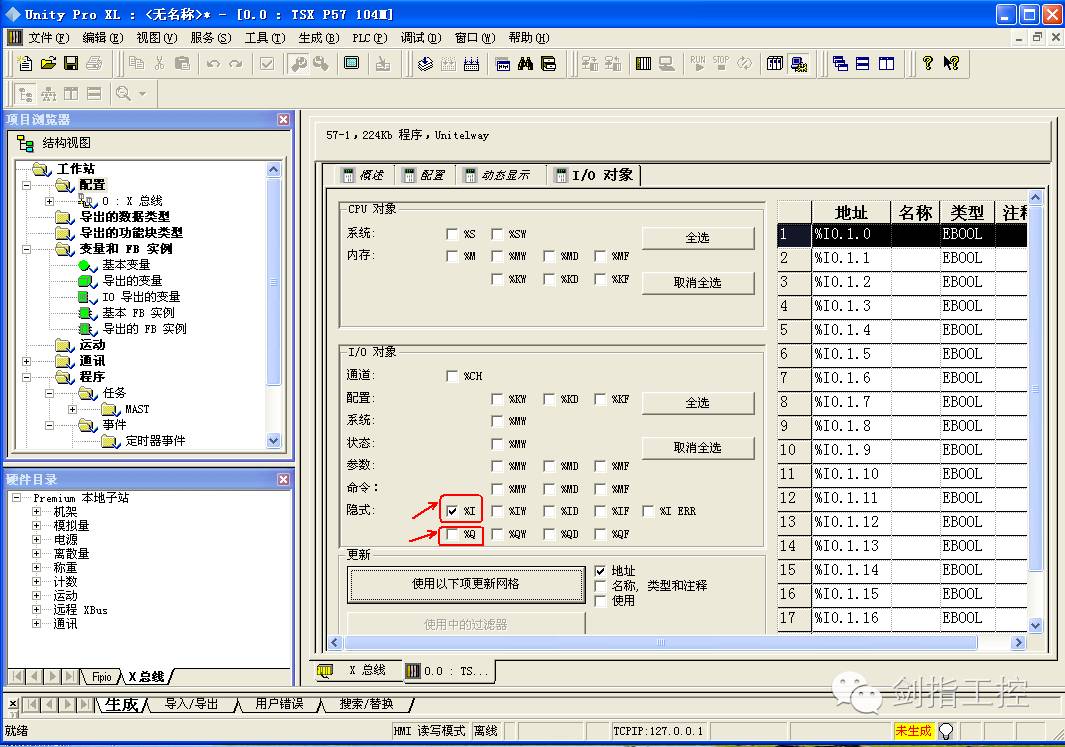 2.1.8 点击“I/O对象”,在“%I”处打钩,点击“使用以下项更新网络”,查看开关量输入模块地址(开关量输处模块地址“%Q”处打钩)