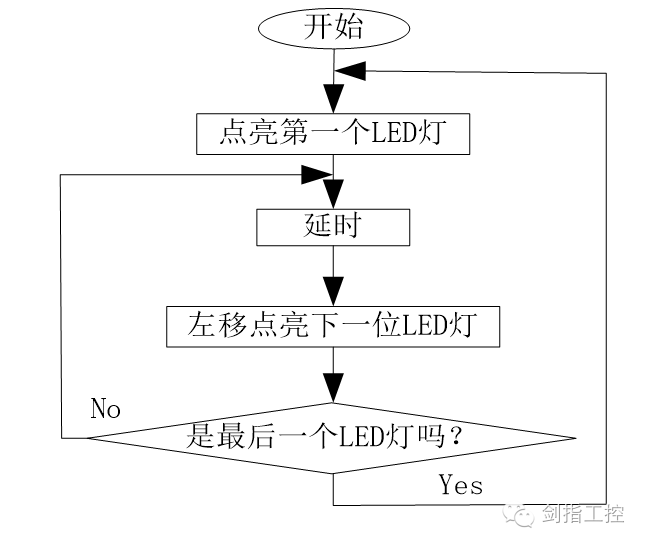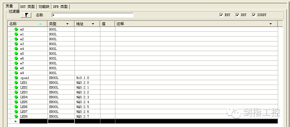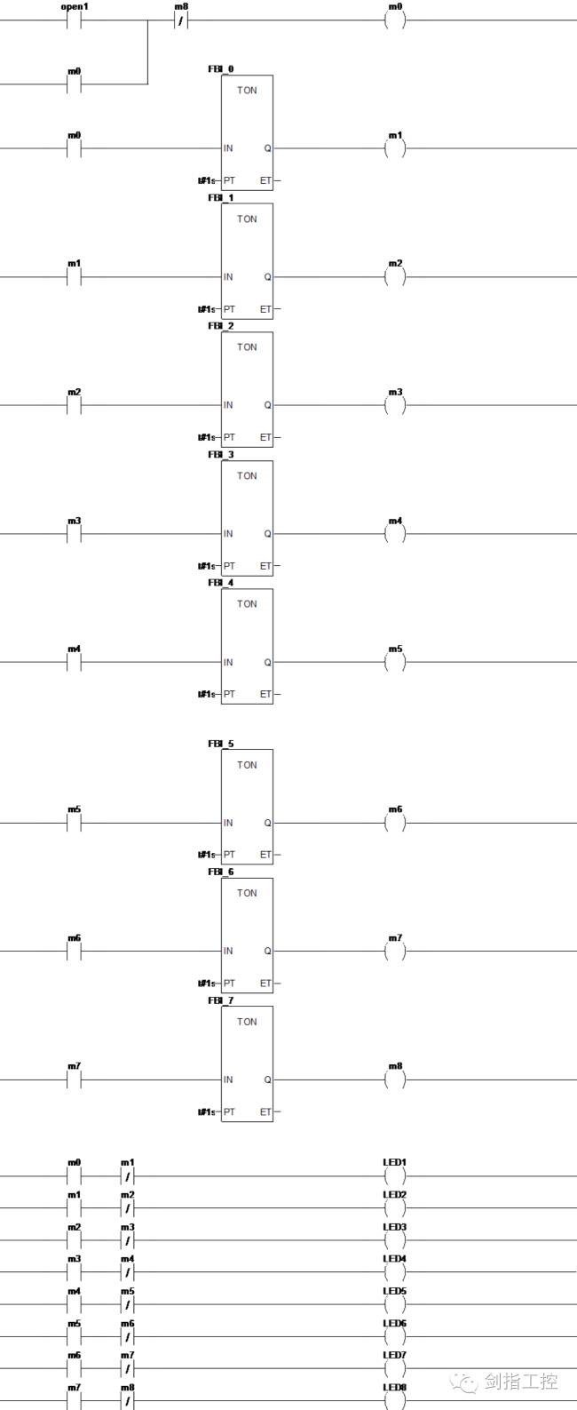 说明:m0-m8为中间变量,open1(常开触点)地址为:%i0.1.0;LED1-LED8(输出线圈)地址为:%q0.2.0-%q0.2.7