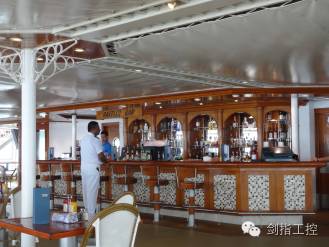 说到“Captain Bridge(邮船驾驶室)”,它是位于观景廊桥中部一个很不显眼的位置,有一个标识,但中国人看不懂或者不注意,我们前些天就没有下去过。后来还是一个老外告诉我们的团友,我们才得以一窥究竟。经过一段旋转式楼梯下了一层楼,看到了一个存放邮船资料的陈列室,陈列室靠船头有一整块固定玻璃观察窗,透过观察窗就可以清楚地看到邮船的主控室。