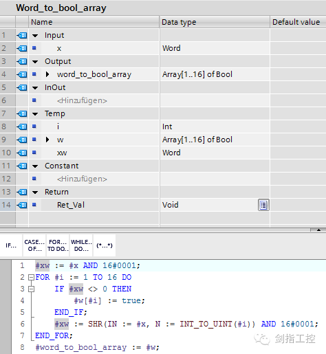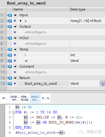 STEP 7 库 "STEP7_(TIA_Portal)_Array_to_Word" 包含了两个函数,用于在"Array[1..16] of Bool"类型数据和"Word"类型数据间进行值的传递 。 S7-1500的这两个拷贝功能的程序代码是由SCL语言生成的。