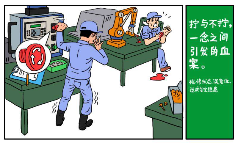 “哎,这机器怎么停了?得复位才行。”小张脑海里浮现出车间主任严肃的面孔,他生怕耽误生产挨批评,赶紧转动急停按钮进行复位。