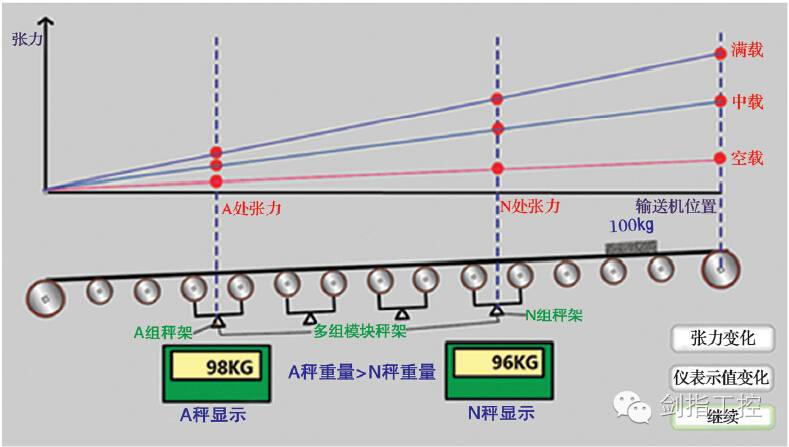 前面已经介绍南京三埃工控股份有限公司开发的“阵列式皮带秤”,它可以通过数学模型修正皮带张力对称重的影响。而江苏赛摩电气股份有限公司2014年推出高精度维稳皮带秤技术能够自动检测皮带秤张力对称量的影响,并针对性地进行自动补偿,以实现电子皮带秤对环境的自检测、自适应和自调节。该技术在输送机不同位置安装多组皮带秤秤架,由于多组皮带秤秤架中的首尾2个秤架A、N安装点的皮带张力不同,导致相同物料重量通过这2组皮带秤架检测到的物料重量值不同,A组秤架受力大于N组秤架受力,位置差=A-N(见图3)。