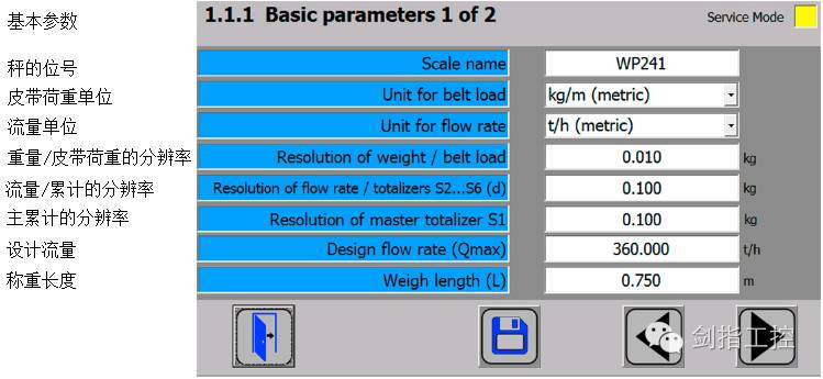 图7是在操作面板上的皮带秤基本参数组态画面,共2个画面,这是第一个。