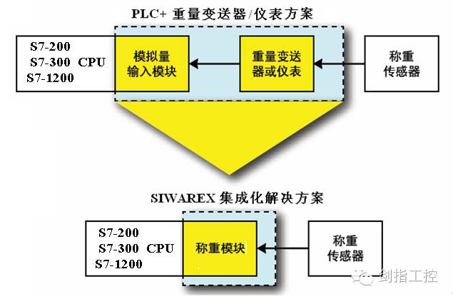 西门子公司为了提供一体化大型交钥匙工程项目,在上世纪七十年代与称重设备的制造商进行合作,研究以西门子PLC模块作为接口,将称重功能集成到PLC平台上。为此开发了基于PLC的称重模块SIWAREX,其特点是这些模块可以像普通模块一样接入PLC,而这些模块可提供称重传感器的精确电源和高精度称重传感器的信号处理。最早开发的是用于静态称重设备的称重模块,将称重传感器信号传送到PLC中处理,PLC就像称重仪表一样计算称重传感器称量的重量,如SIWAREX U称重模块可用在基于重量的物位测量和平台称重上。