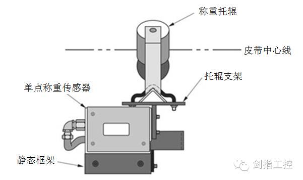由图3可见,2台单点称重传感器是固定在皮带输送机纵梁上的静态框架上,通过托辊支架,称量托辊将承受的物料重量传递给单点称重传感器,其秤架结构形式为单托辊双端直接承重式,物料重量的传递不经过支点、杠杠的转换而直接传力给称重传感器。