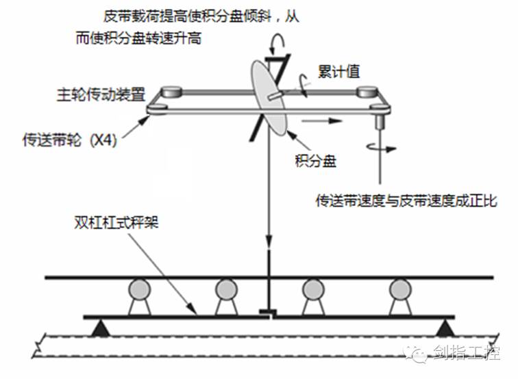 图1是梅里克称重公司机械式皮带秤的工作原理,关键的设备是一个圆形的积分盘,双杠杠秤架上的物料荷重通过机械装置转换成积分盘转轴与水平线的倾斜角度,在积分盘外缘的圆周上装有多个小滚轮,小滚轮可在一根转动的传送带的带动下旋转,从而带动积分盘的转动。积分盘转动时,其轴旋转使累计计数器工作。带动小滚轮旋转的传送带则由安装在输送机皮带上的测速传感器驱动,所以输送机皮带速度越快,传送带的速度也越快。积分盘轴旋转的速度取决于两个因素,一个是传送带的速度,另一个是积分盘倾斜的角度。根据原理我们可以分析:当秤架上的物料荷重越大时,积分盘倾斜的角度越小,在传送带同样速度带动下积分盘的转动速度越快;当秤架上的物料荷重为零时,倾斜角度成90°,在传送带同样速度带动下积分盘转动速度也为零,所以积分盘轴旋转的速度代表了秤架上的物料荷重与输送机皮带速度的乘积。