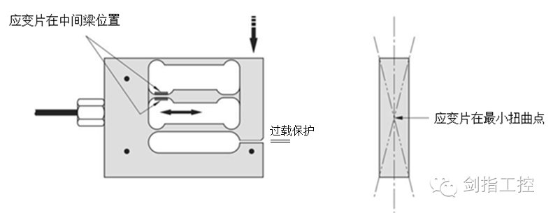 妙声力公司在MSI单托辊秤架设计中应用的单点称重传感器是一种独特的三梁平行四边形称重传感器(见图4),原来是使用在妙声力公司的M系列冲量式固体流量计上。以往的双梁单点称重传感器,电阻应变片被放置在传感器的上、下部柔性曲面上,用它们来测量由于称重传感器的偏移变形而导致的张力式和压力式的应变力。当秤架的水平位移或载荷偏心而产生水平分力时,这一水平分力将被叠加到正常的弯曲应力上作为载荷的一部分,从而引起测量误差。三梁平行四边形称重传感器的设计仅测量放置在两个外部梁(或柔性曲面)之间中心梁上的垂直分力,位于中心梁的电阻应变片比传统的双梁设计提供了更好的性能,它不受秤架的水平位移或载荷偏心而产生水平分力的影响,因此避免了具有上、下部柔性设计使用中常见的测量误差。图中,三梁平行四边形称重传感器还带过载保护。