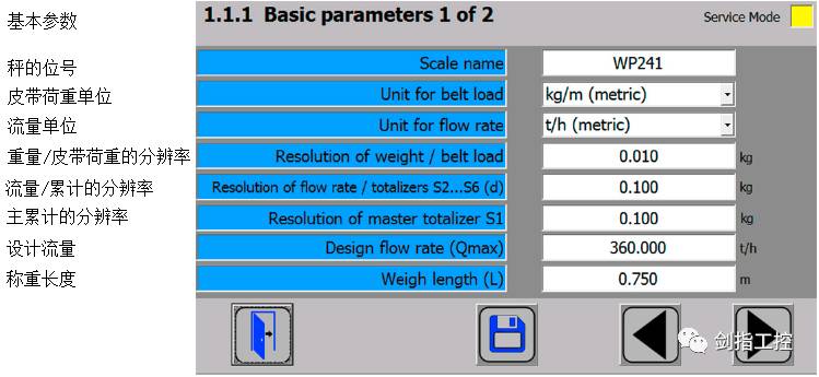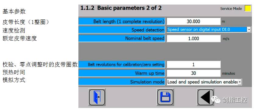 在HMI操作面板上我们可以像单机控制器一样调出皮带秤基本参数组态画面,共2个画面,第一个画面(见图5-6)需设置以下基本参数:秤的位号、皮带荷重单位、流量单位、重量/皮带荷重的分辨率、流量/累计的分辨率、主累计的分辨率、设计流量和称量长度,第二个画面(见图5-7)需设置以下基本参数:皮带长度、速度检测、额定皮带速度、调校时的皮带圈数、预热时间和模拟方式。