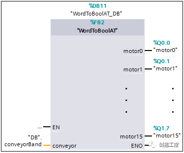 利用FB “WordToBoolAT” 可以从一个数据类型为 "Word" 的变量中提取最多 16 个信号 (数据类型为 “Bool”的变量) 。输入变量 "conveyor" 的内容被传送到静态变量 "statConveyor" 并被声明为带关键字 “AT” 的变量"statMotors" 覆盖。然后数组类型变量 "statMotors" 的每一位被分配到 Bool 数据类型的输出变量中。