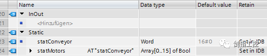 利用FB “BoolToWordAT” 可在一个字中组合多达 16 个位。每个 Bool 类型输入变量被分配到静态变量"statMotors"数组并被带关键字 “AT” 的"statConveyor"变量覆盖。然后静态变量"statConveyor"的内容被传输到输出变量"conveyor"中。