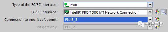 将“ PG/PC 接口类型 ” 设置为 “ PN/IE ”。 打开 PG/PC 选择 “ 子网的连接 ” 并选择连接到 CPU 的子网。