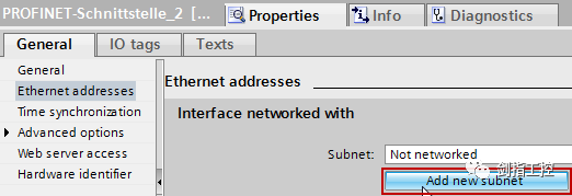 点击 CPU 以太网接口。 在 “ 属性 > 常规 > 以太网地址 ” 并点击 “添加新子网 ”。