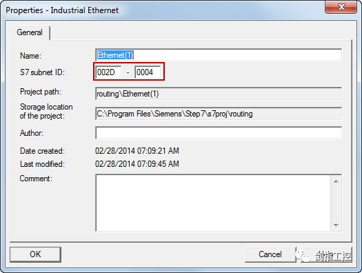 点击 以太网子网并选择 “ 属性 > 常规 > 常规 ” 进入到 STEP7 V5.5 项目 S7 子网 ID (上文中步骤4 )。