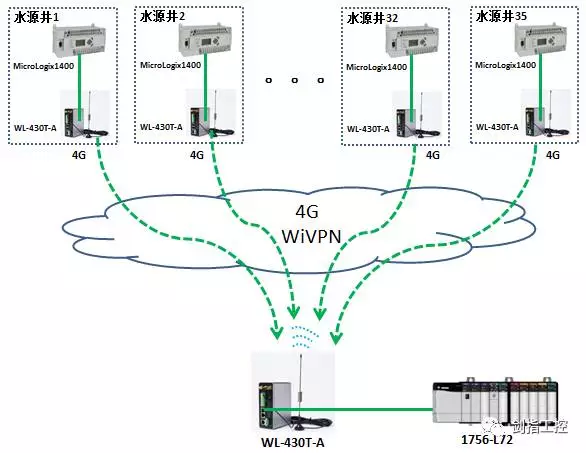 某水厂外围水源井众多,这些水源井控制系统的控制器使用Rockwell的MicroLogix1400系列PLC。水厂中控室安装有一套冗余的Controllogix系列PLC,在水厂运行的功能设计中,中控室的PLC需要和外围水源井的PLC进行MESSAGE通讯来控制水源井设备的运行和获取水源井设备的运行信息生成报表。水源井距离水厂中控室距离远,并且分布在中控室周边各个方向。