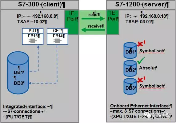 通过以太网可以实现S7-1200与S7-300连接通信。S7-300可以使用带集成口CPU或通信处理器(CP343-1)连接到工业以太网上,它们都提供S7 通信的功能,既可作为客户机,也可以作为服务器,所拥有的连接资源可参见相关产品手册;S7-1200 集成以太网接口,提供S7 通信的功能,只能作为服务器,可以同时建立3 个通信连接。