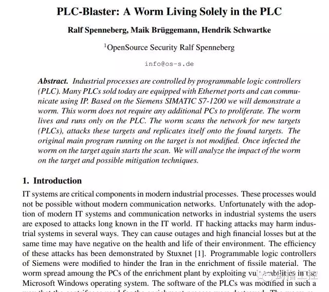 近日,有消息报道,Spenneberg(斯班伯格)和Brüggeman(布鲁格曼)两位研究人员,研究出一种可以在西门子 S7 1200 可编程控制器之间像癌症一样的扩散, 并在改编之后作用于其他系统的真正的工控蠕虫病毒。