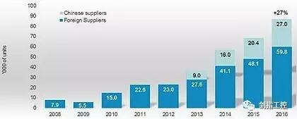 2016年中国创记录的新增安装了工业机器人——87000台,与2015年相比增长了27%。而其中,约有27000台由中国制造。在2016年,中国市场中机器人销售和服务总数,更是高达340000台,比2015年增加了33%。