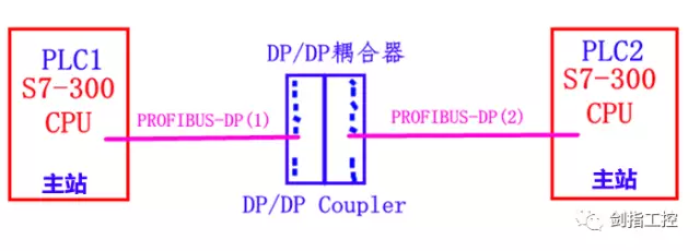 从上图我们可以看出,PLC1和PLC2都有自己的PROFIBUS-DP网络,且在自己的网络中都是主站,它们通过DP/DP耦合器进行数据的交换