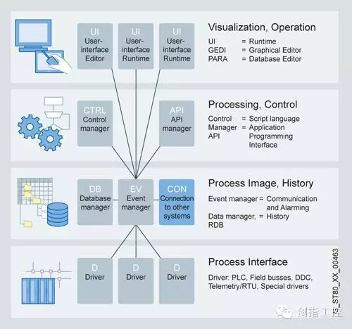 西门子与 2007 前并购的 ETM 专业控制软件公司致力于开发过程可视化和控制系统 SIMATIC WinCC 开放式构架,其前身称谓 PVSS。SIMATIC WinCC 开放式构架是 SIMATIC HMI 系列的一个组成部分,针对的是具有特殊要求的客户。