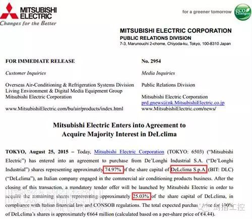 2015年8月25日,日本三菱电机在中国官网发布公告,将从德龙集团(De’LonghiIndustrial S.A)手中收购意大利中央空调制造巨头DeLclima公司74.97%的股份,并计划在2015年内收购剩余的25.03%的股份,并购总代价高达6.64亿欧元(约合48.87亿元人民币)。