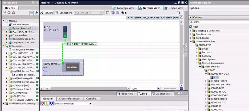 2、 打开例子TIA项目,其中会包括思科交换机的配置,可以看到思科交换机的设备和网络。