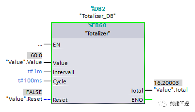 使用库'Totalizer_Lib_TIA_Portal' 中的函数块 'Totalizer' ,可以计算出一个瞬时流量的累积值。