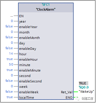 通过“clockalarm”功能块,可以实现事件单次执行,或每年,每月,每日,每小时,每分钟以及每秒执行。